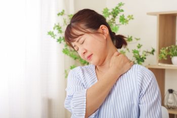 首の前側や横側、付け根あたりの動きがかなり制限されていることが多いです。