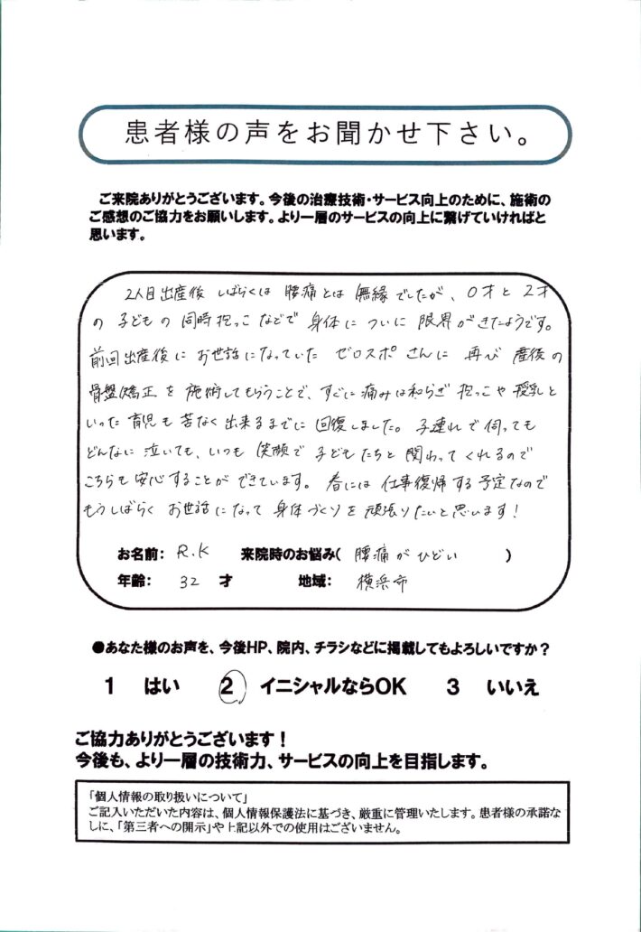 R.K様 産後骨盤矯正 32歳 横浜市