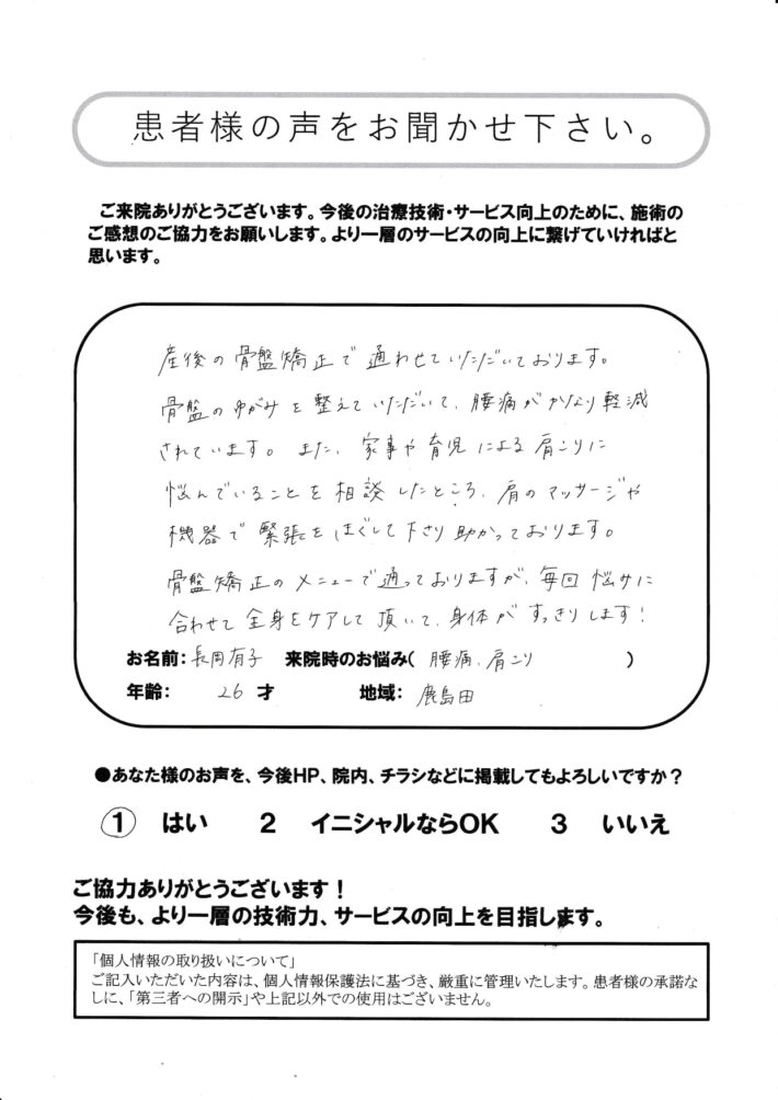 産後の骨盤矯正で通わせていただいております。
